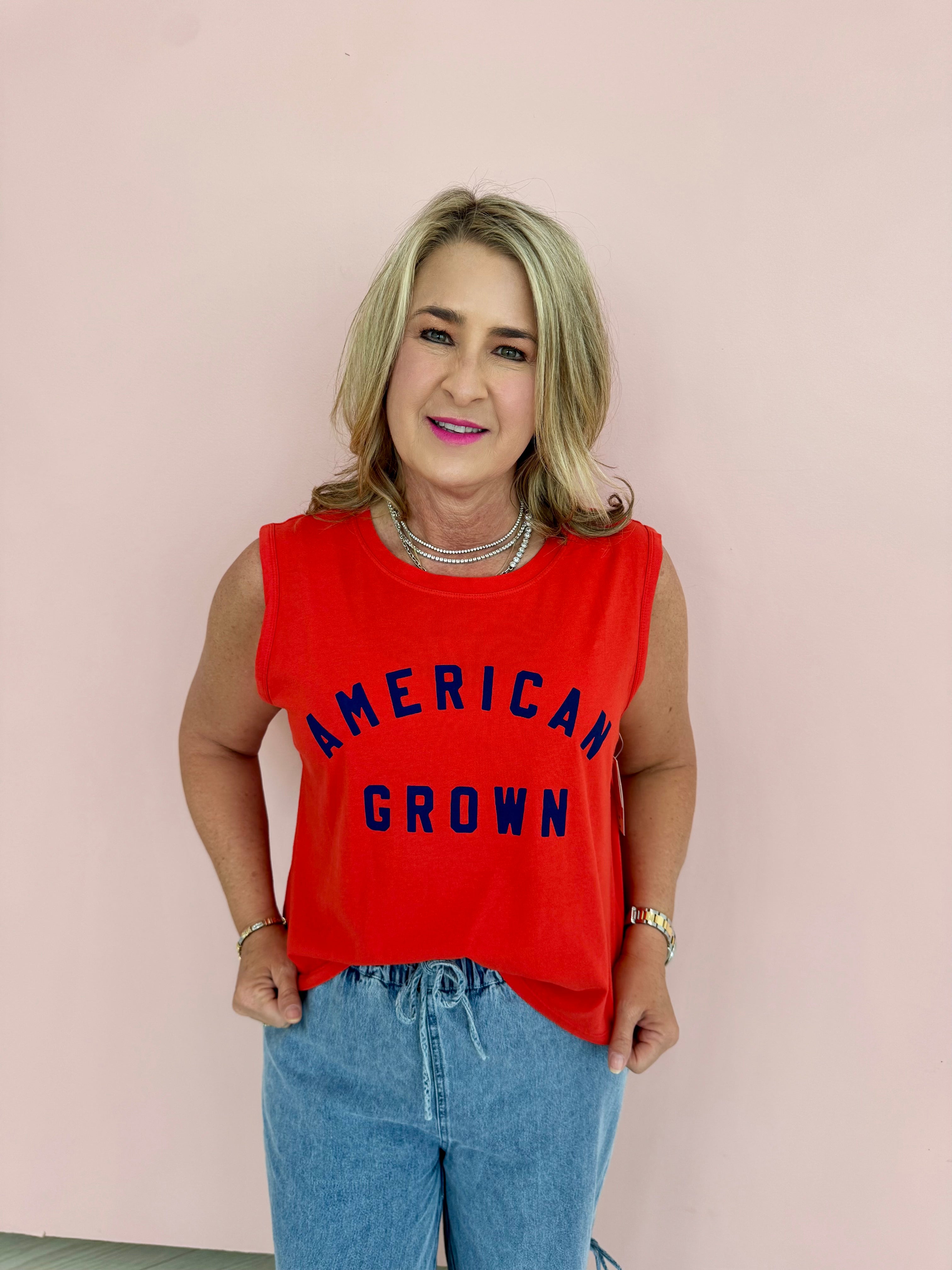 This red tank top proudly displays the words "American Grown", making it the perfect piece for any patriotic occasion. Made with high-quality materials, it offers both style and comfort. Show your support for American made products with this stylish and meaningful top.