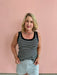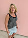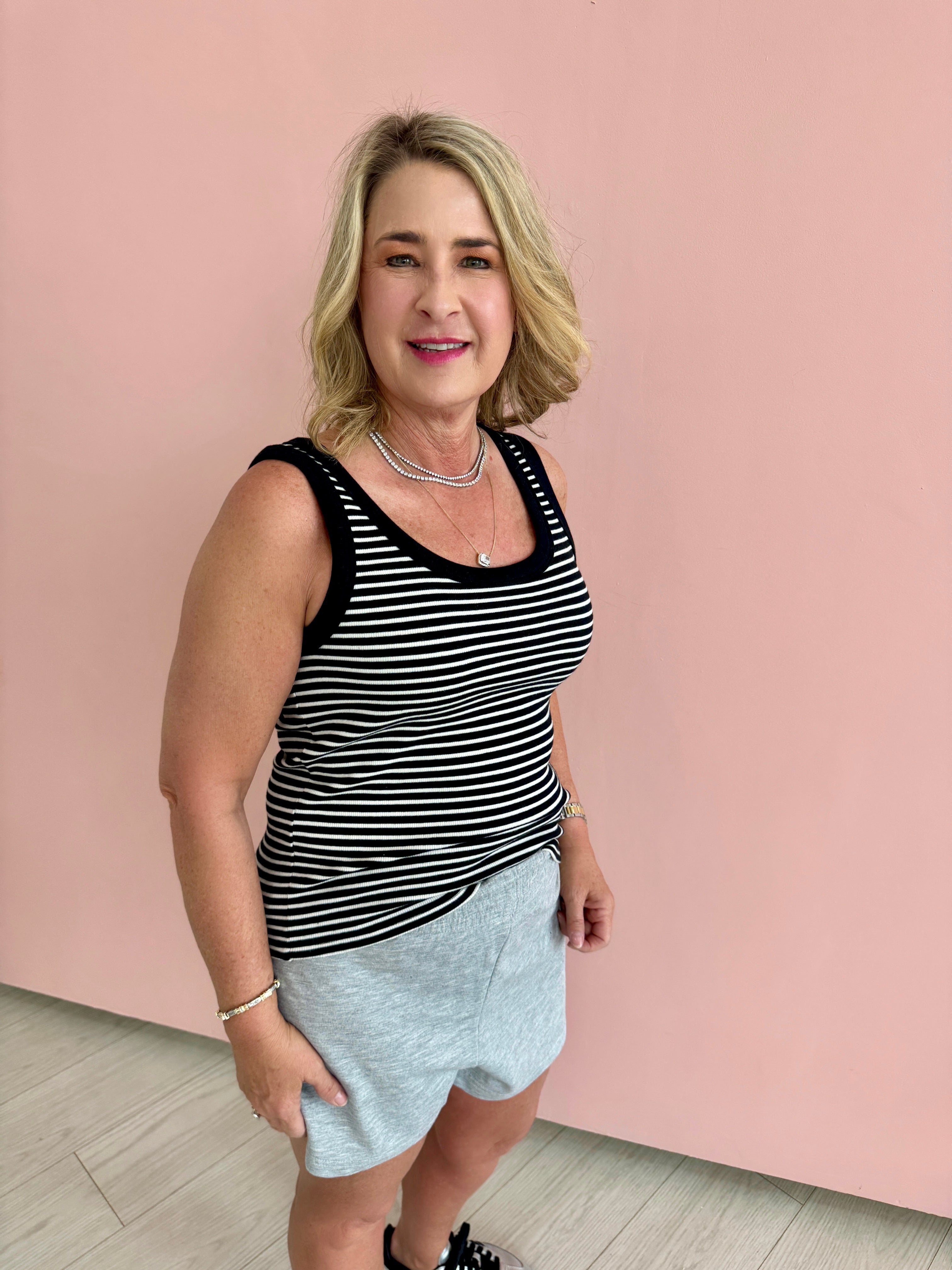 The Elin Stripe Rib Tank in black offers a modern twist on a classic design. Its sleek, ribbed texture and bold striped pattern create a flattering silhouette that can easily be dressed up or down. Made with high-quality materials, this tank promises both style and comfort.