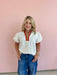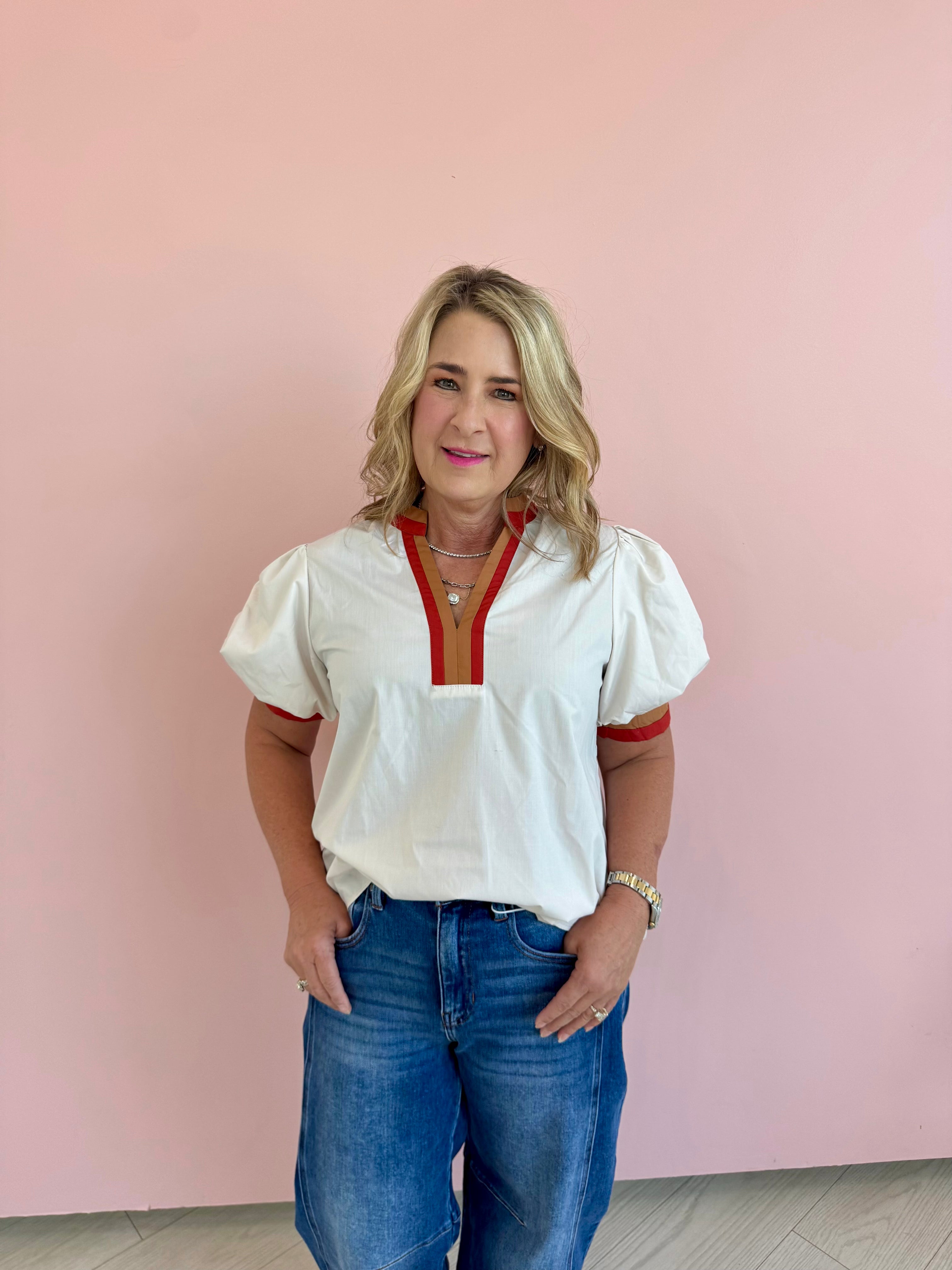 The Elonore Blouse showcases a sophisticated solid short bubble sleeve design with a distinctive multicolor band finish. Crafted from lightweight woven fabric, it offers a semi-sheer, unlined construction that balances elegance with breathability. Ideal for layering or wearing alone, this blouse combines refined style with comfortable wearability.