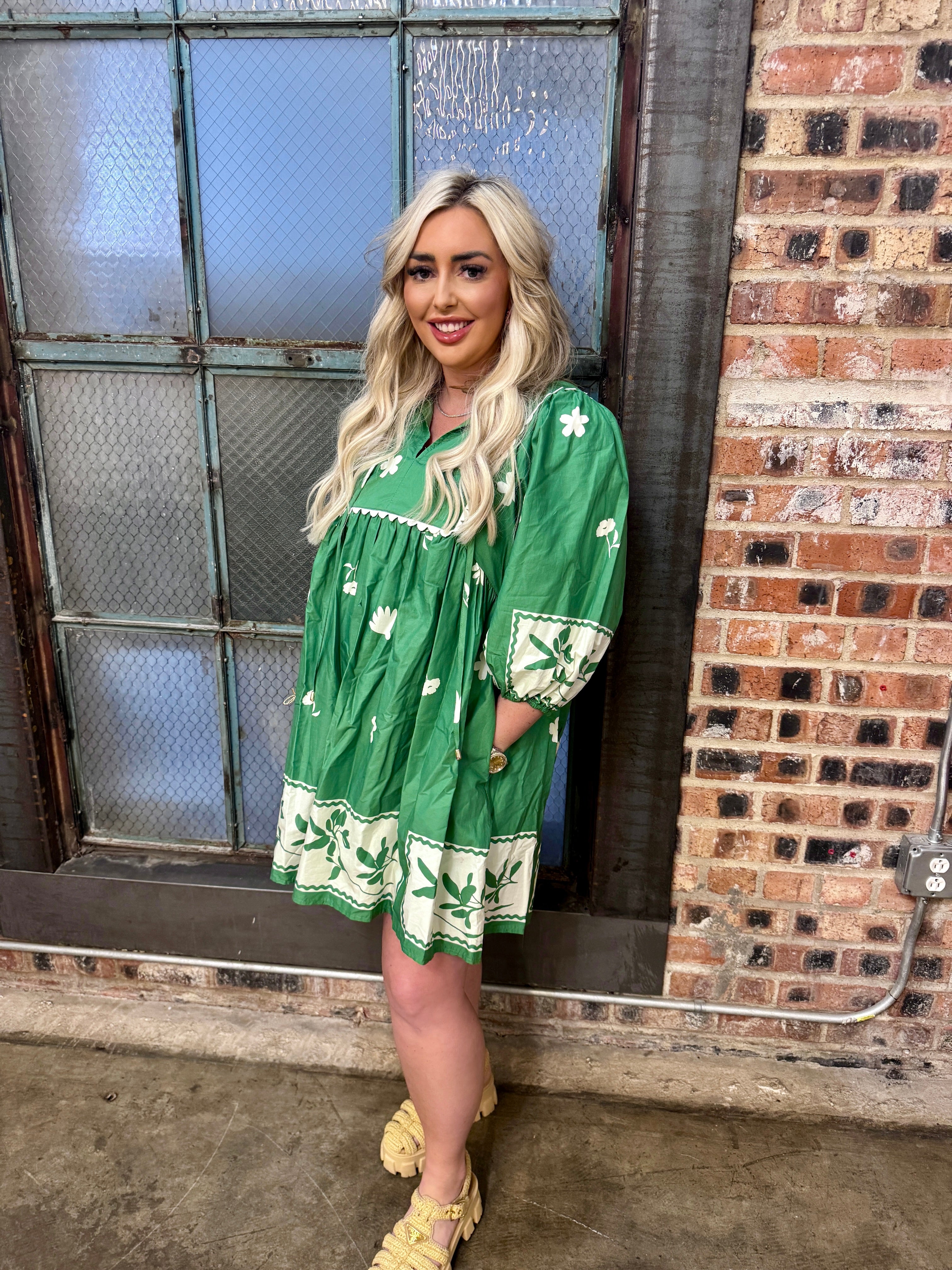 Introducing the Marleigh Dress - the perfect addition to your wardrobe. This mini dress features a stunning floral stencil border print, ¾ sleeve design, and scallop accent yoke. Made with a lightweight and non-sheer woven fabric, this dress is both comfortable and stylish. Stay on trend and elevate your look with this must-have piece.