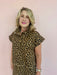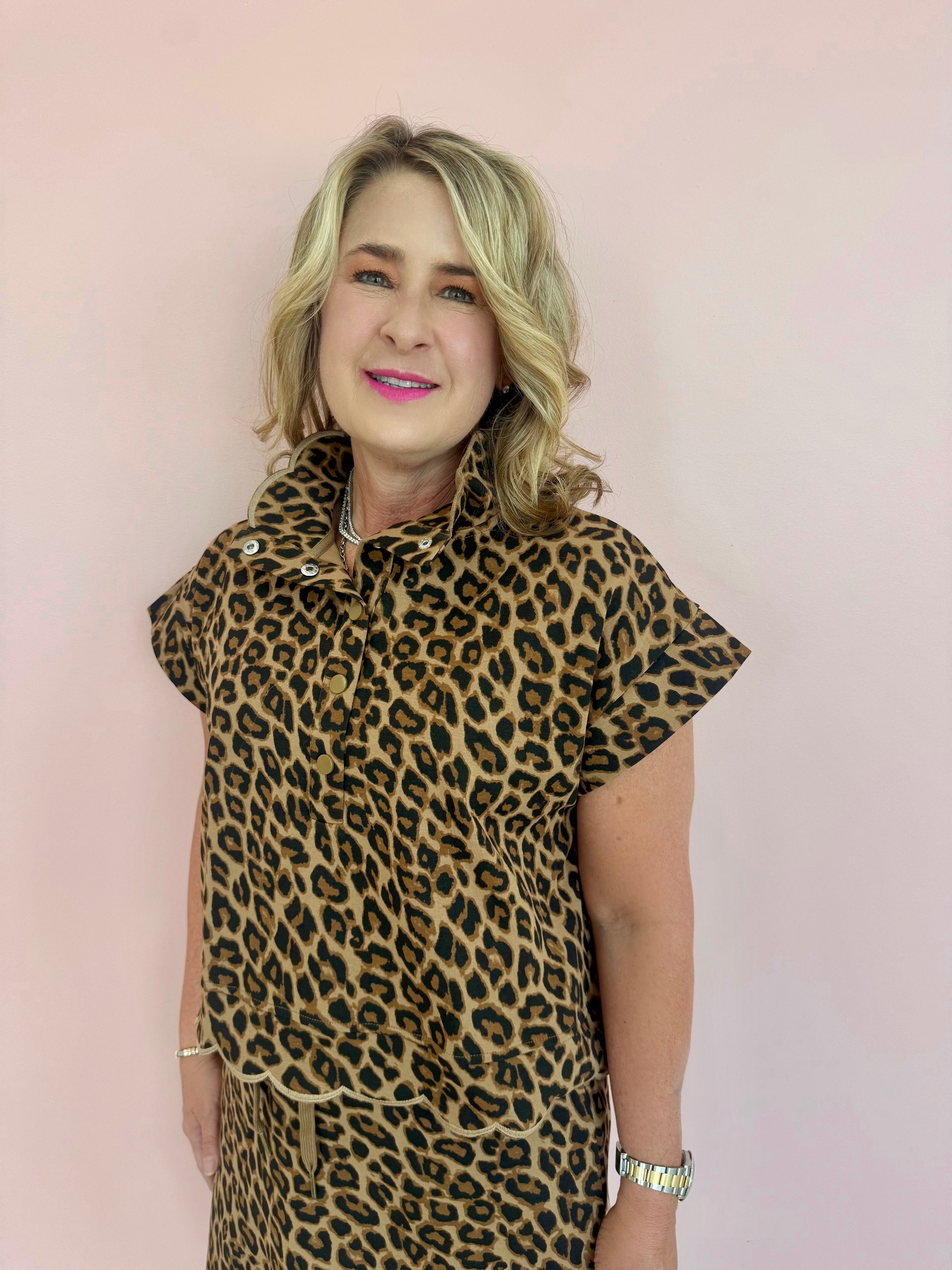 This leopard pattern short sleeve band top combines bold style with refined details. Crafted from lightweight knit fabric, it offers comfortable wear without sheerness. The embroidered scallop hem adds a delicate touch, while the snap button collar closure ensures easy dressing. Unlined for a breathable fit, this top is perfect for layering or wearing on its own with confidence.