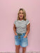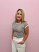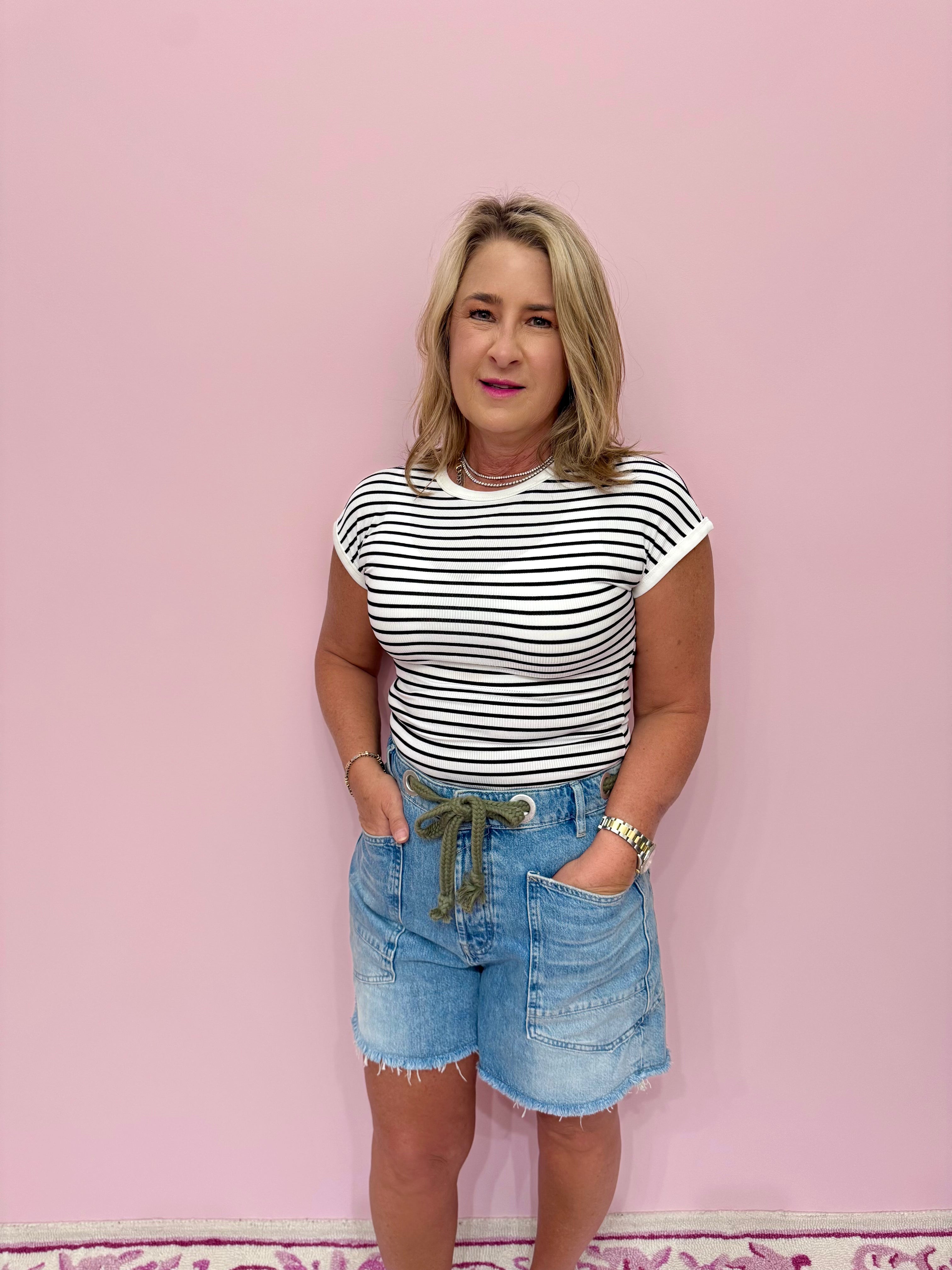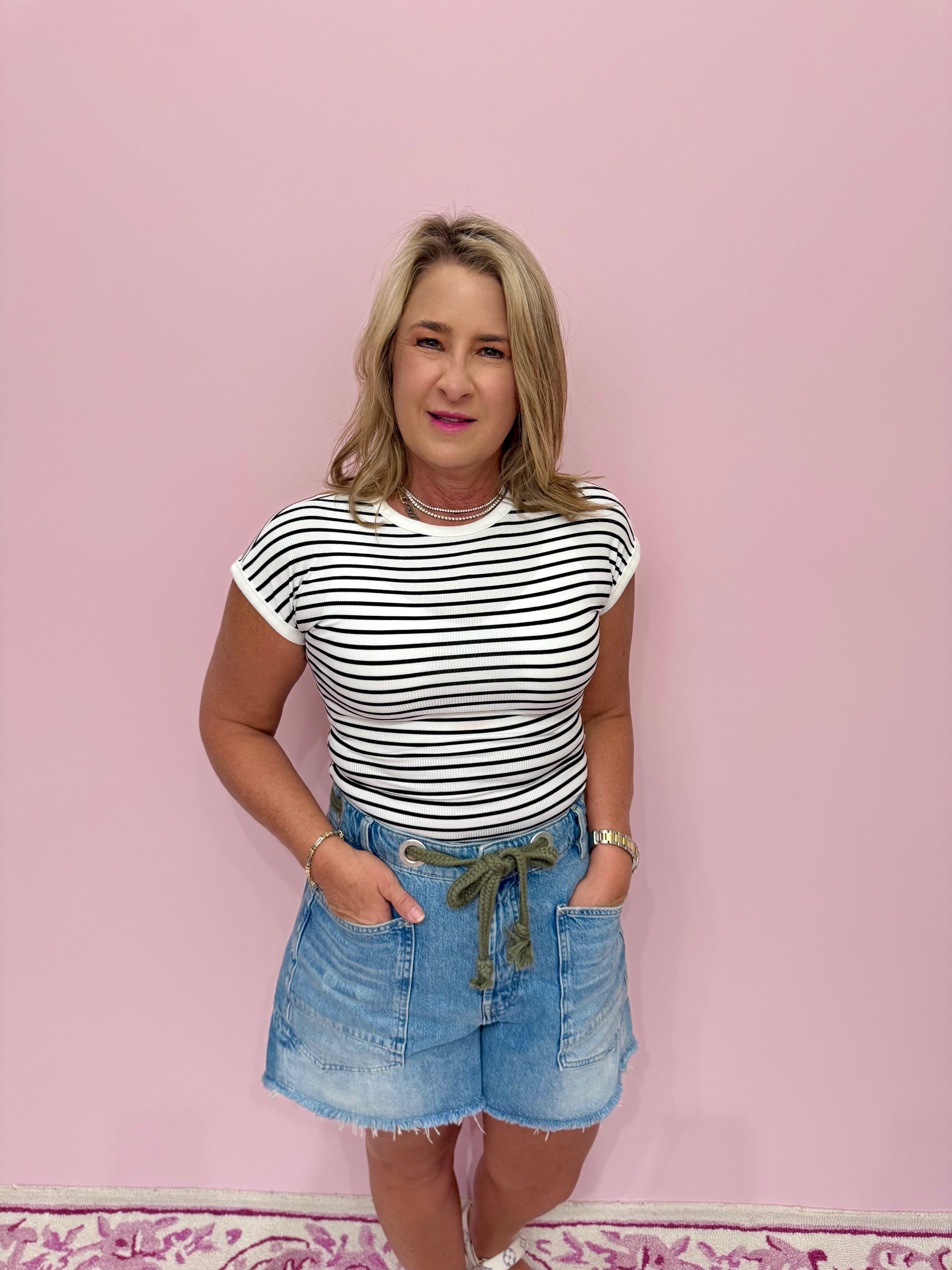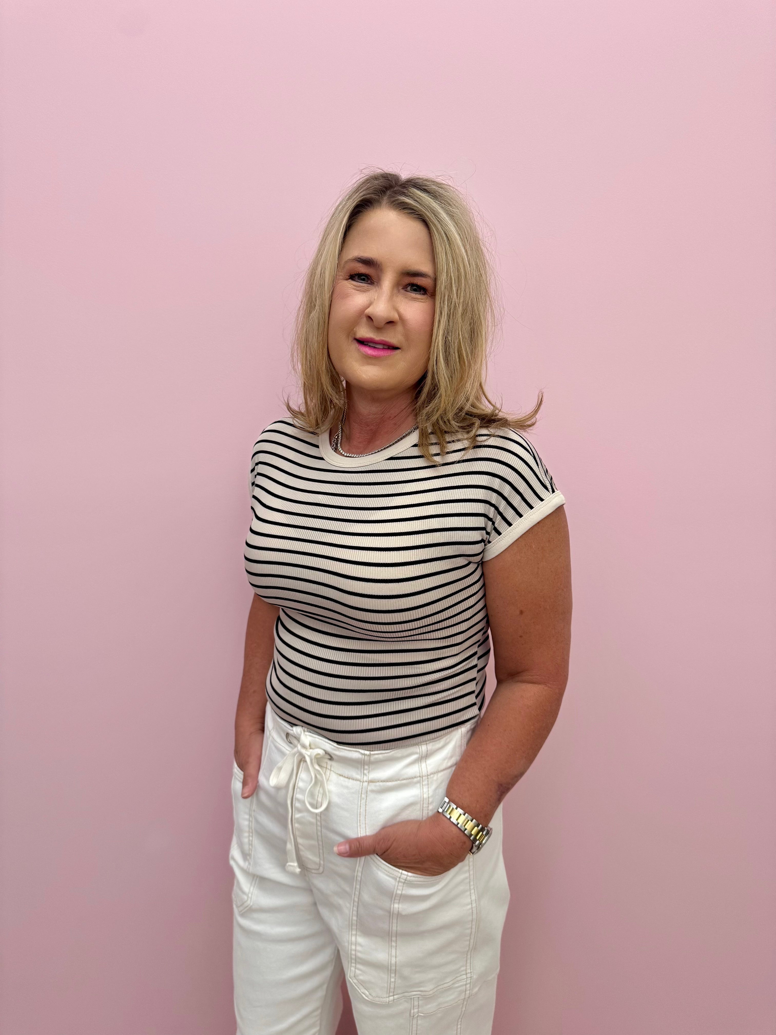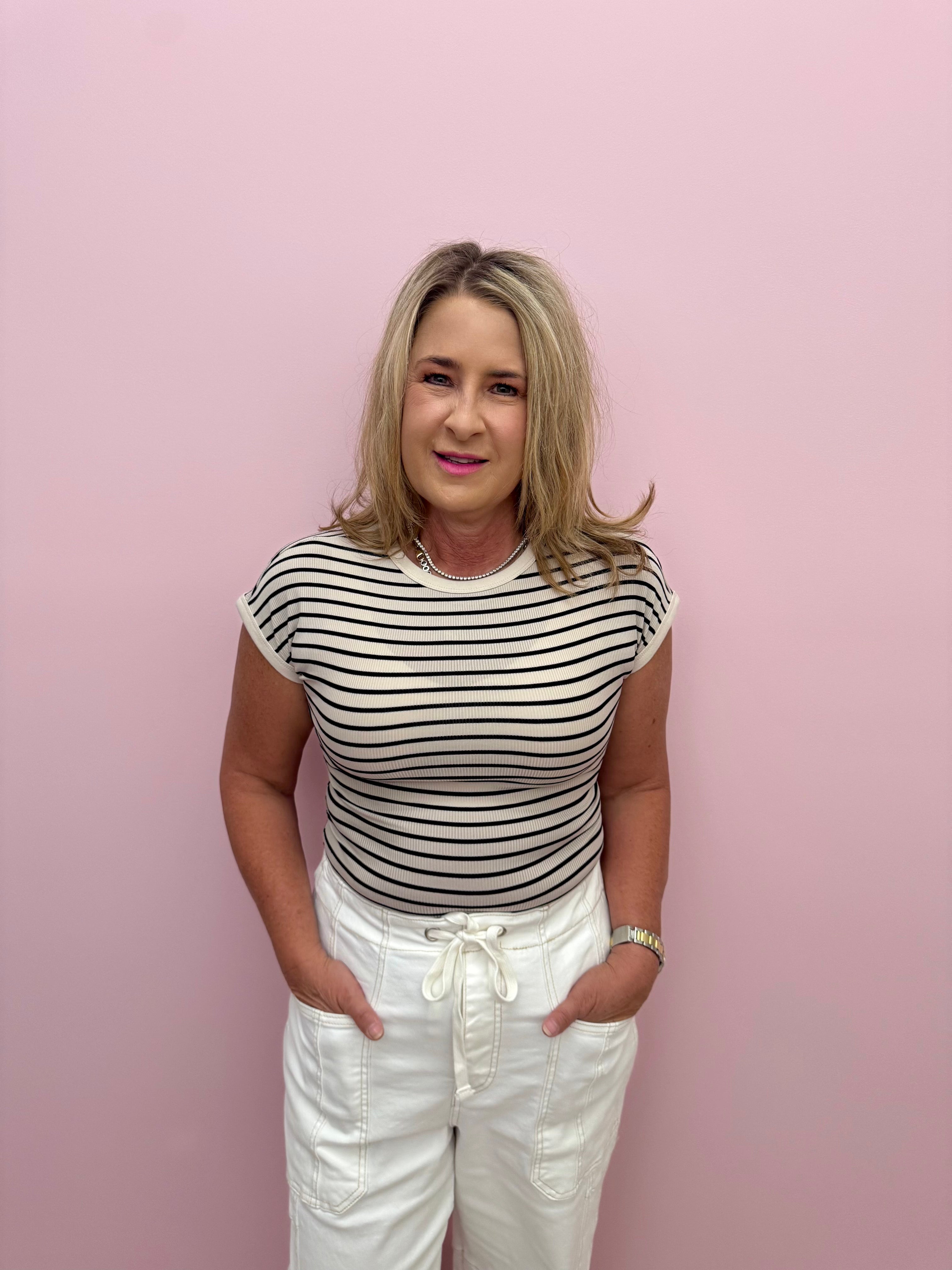 The Miranda Bodysuit features a sleek striped design with cap sleeves, offering a refined silhouette that balances style and comfort. Its tailored fit enhances your natural shape, making it an ideal layering piece or a standout on its own for a polished, contemporary look. Perfect for versatile wear, this bodysuit combines classic patterning with modern cut details.