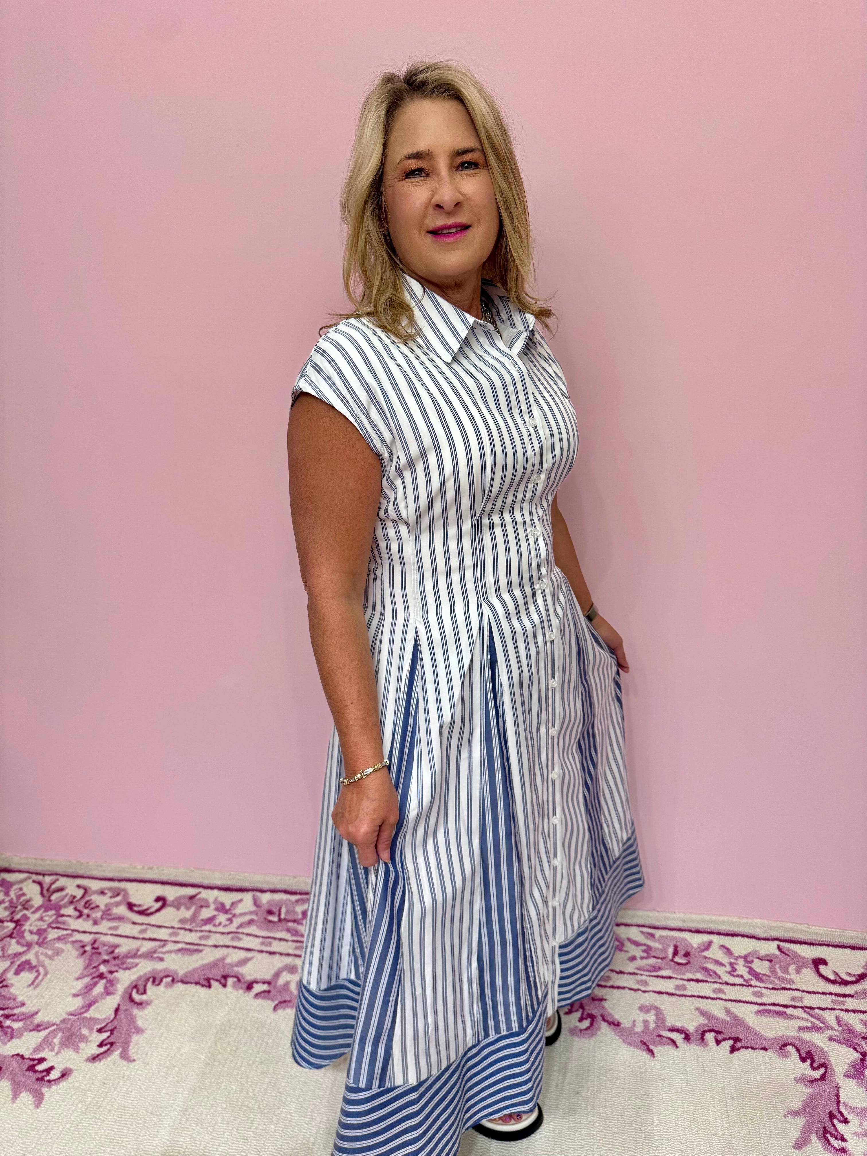 This Neely Striped Dress features a classic collar and a refined blue striped pattern, combining timeless style with a polished silhouette. Ideal for professional or casual settings, its structured design offers both comfort and sophistication, making it a versatile addition to your wardrobe.