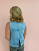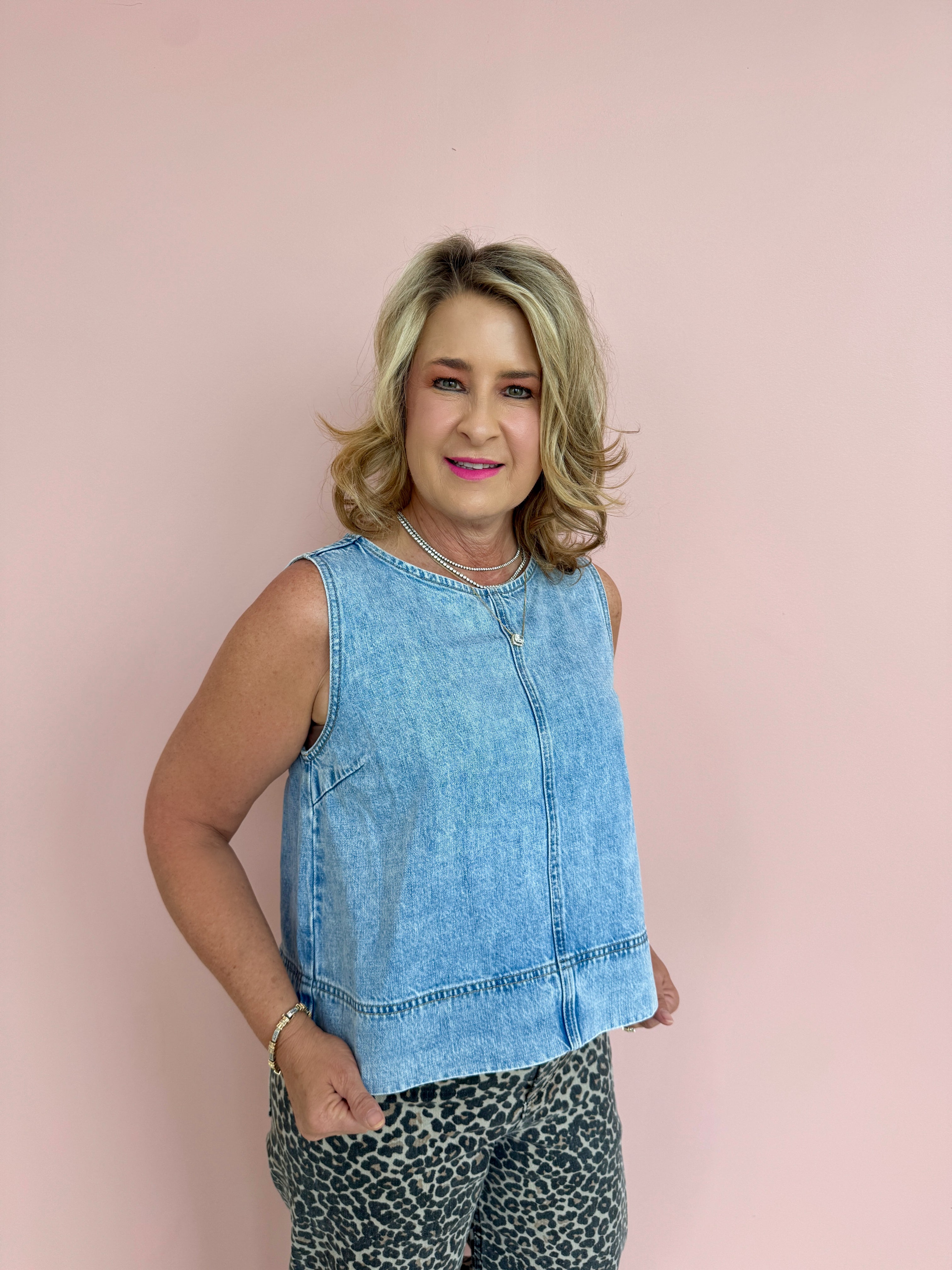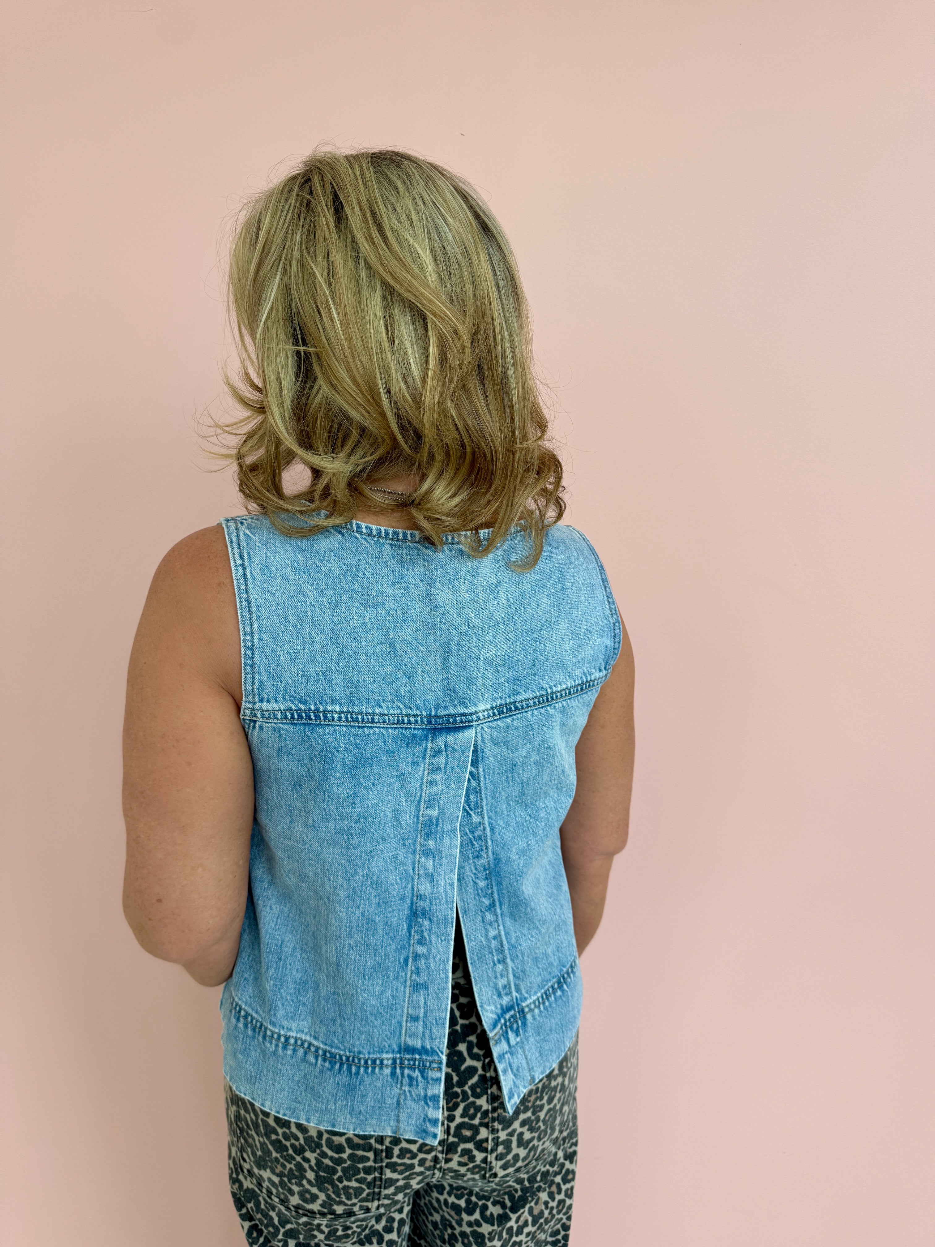 This denim swing tank top boasts a unique cut out in the back, adding a touch of playful style to this classic piece. With a comfortable and flowy fit, this shirt is perfect for a casual day out or dressed up for a night on the town. Expertly crafted with high-quality materials, this shirt is a must-have addition to any wardrobe.
