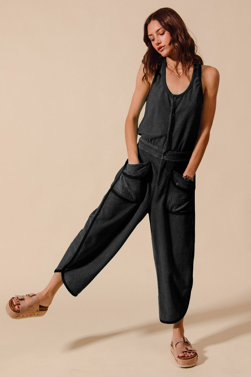 Elevate your wardrobe with our Terry Jumpsuit. This stylish and versatile black washed jumpsuit features a button-up front and a flattering scoop neck, perfect for any occasion. Its relaxed fit ensures comfort while still keeping you on-trend. Upgrade your look today.