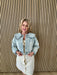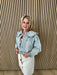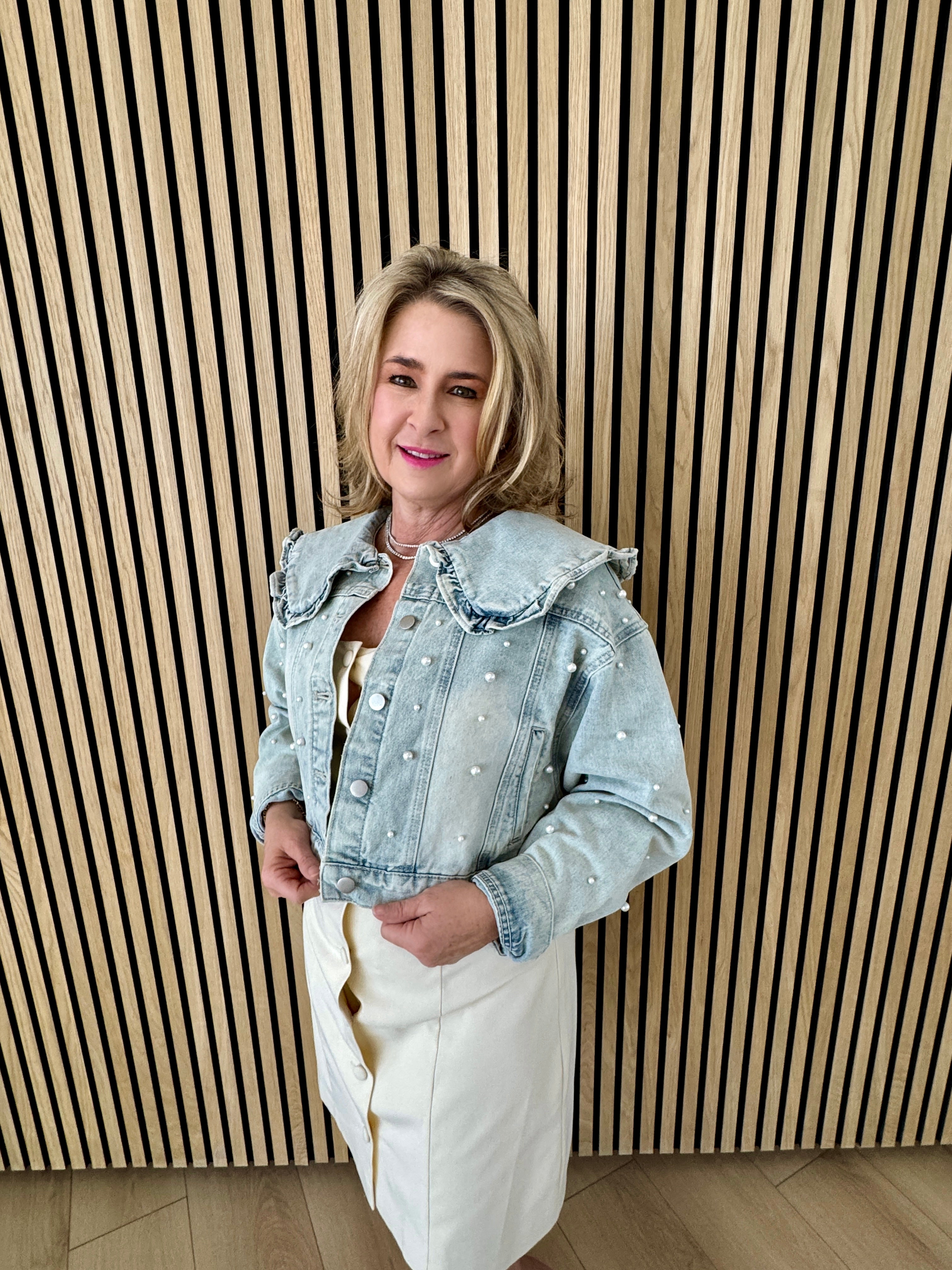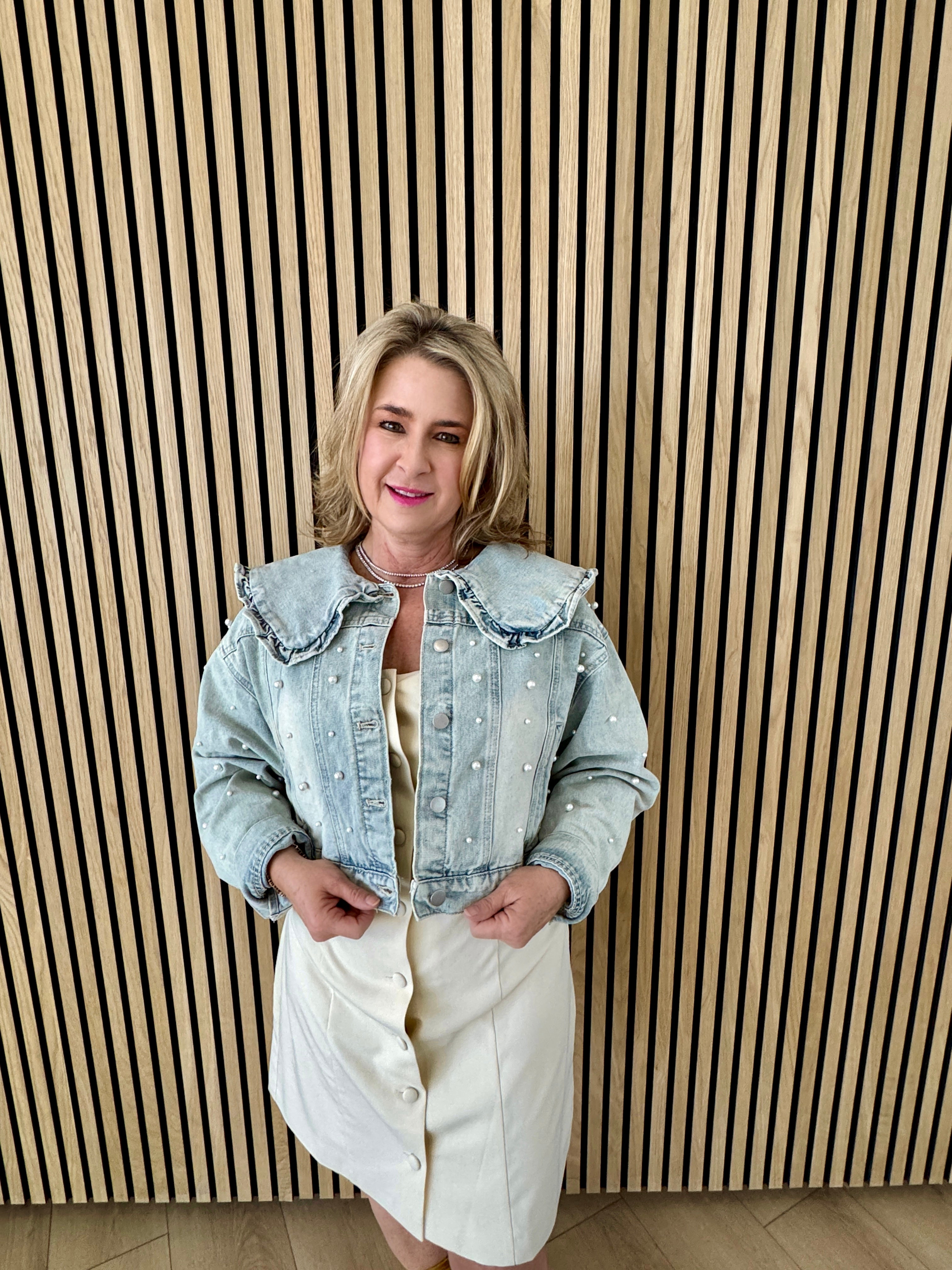 Crafted with a doll collar and pearl detailing, the Tynsley Pearl Cropped Denim Jacket adds a touch of elegance to your casual look. Made with washed denim, this jacket features a cropped design for a modern and stylish fit. Elevate any outfit with this unique and sophisticated piece.