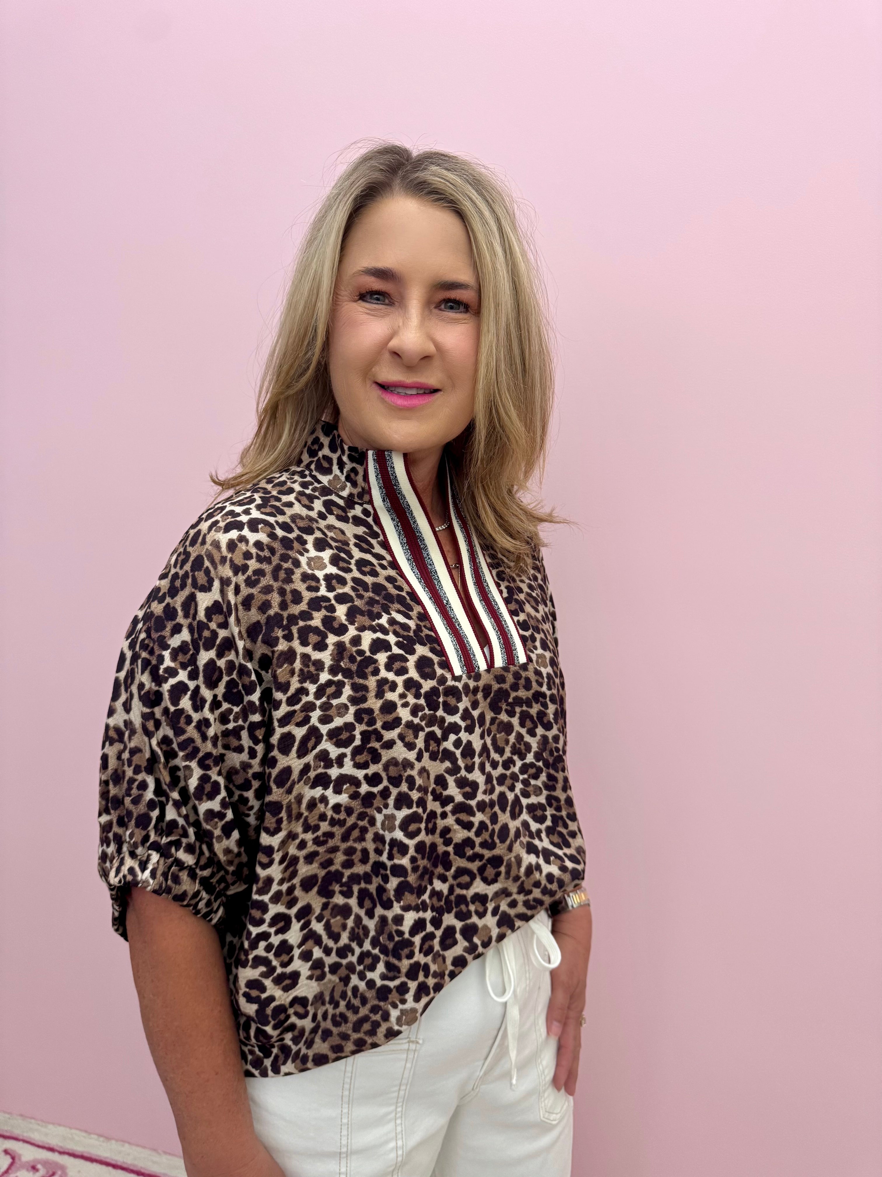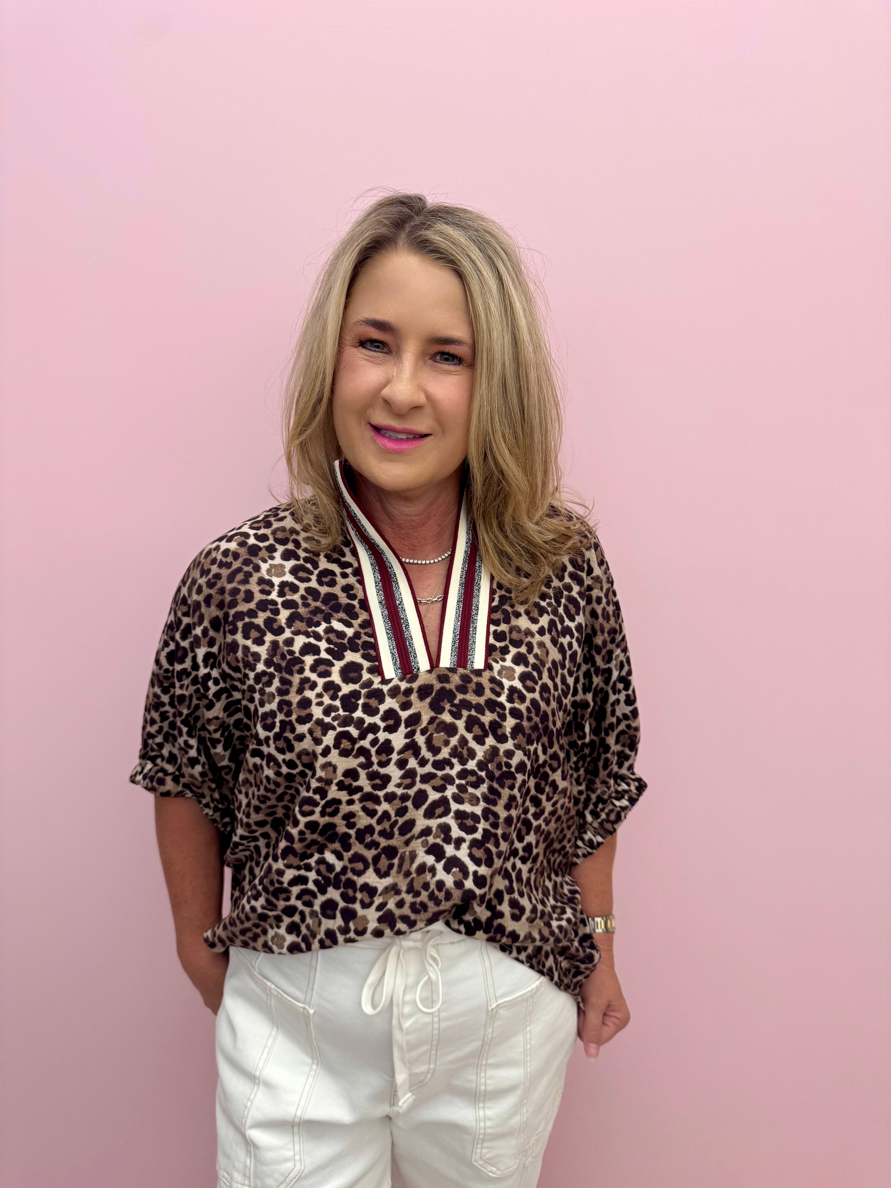 This Wild Top features a sophisticated leopard print design paired with a deep V-neck and a classic collar, creating a bold yet refined look. Crafted to enhance your silhouette, it offers both style and comfort, making it an ideal choice for confident, fashion-forward wardrobes. Perfect for layering or wearing alone, this blouse elevates any outfit with its expert blend of daring pattern and elegant cut.